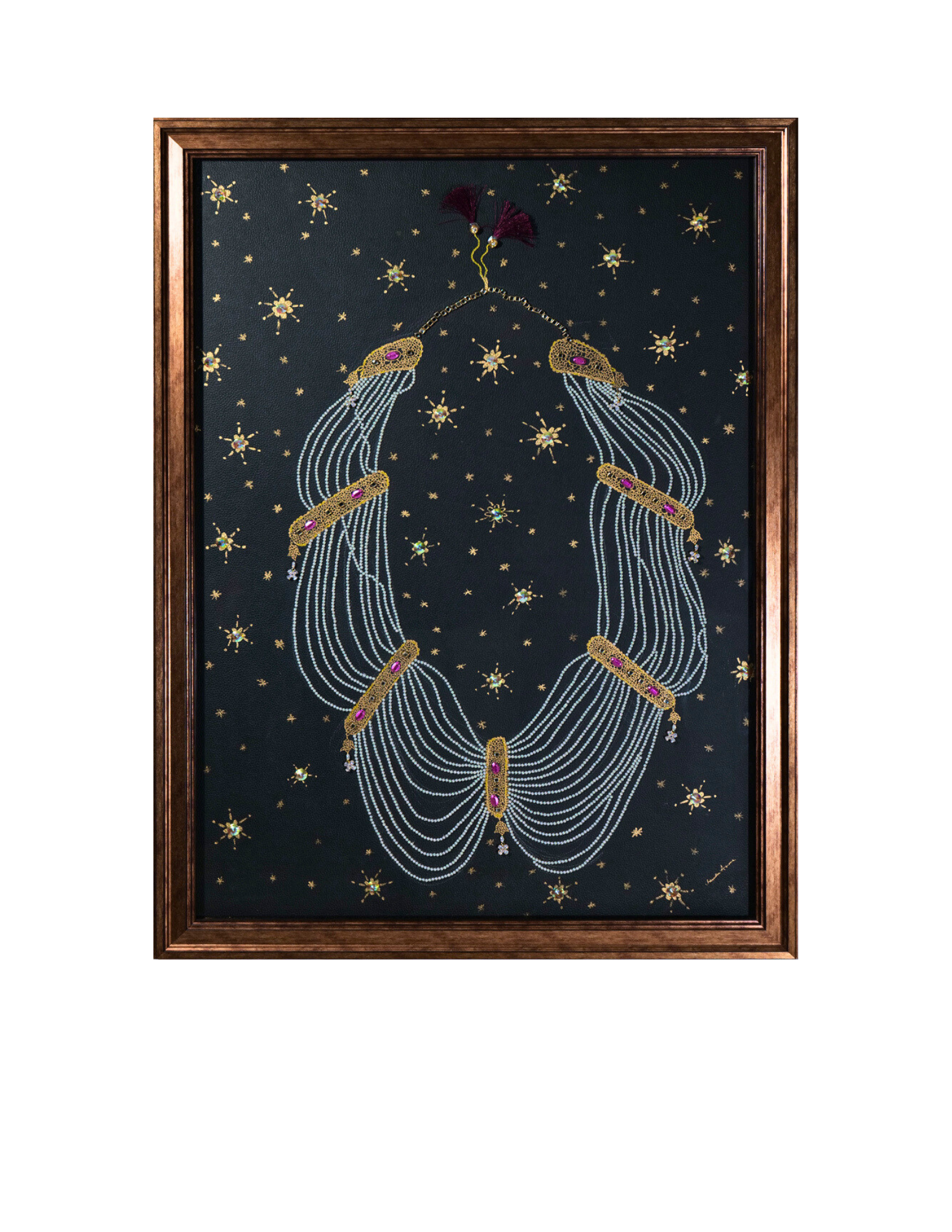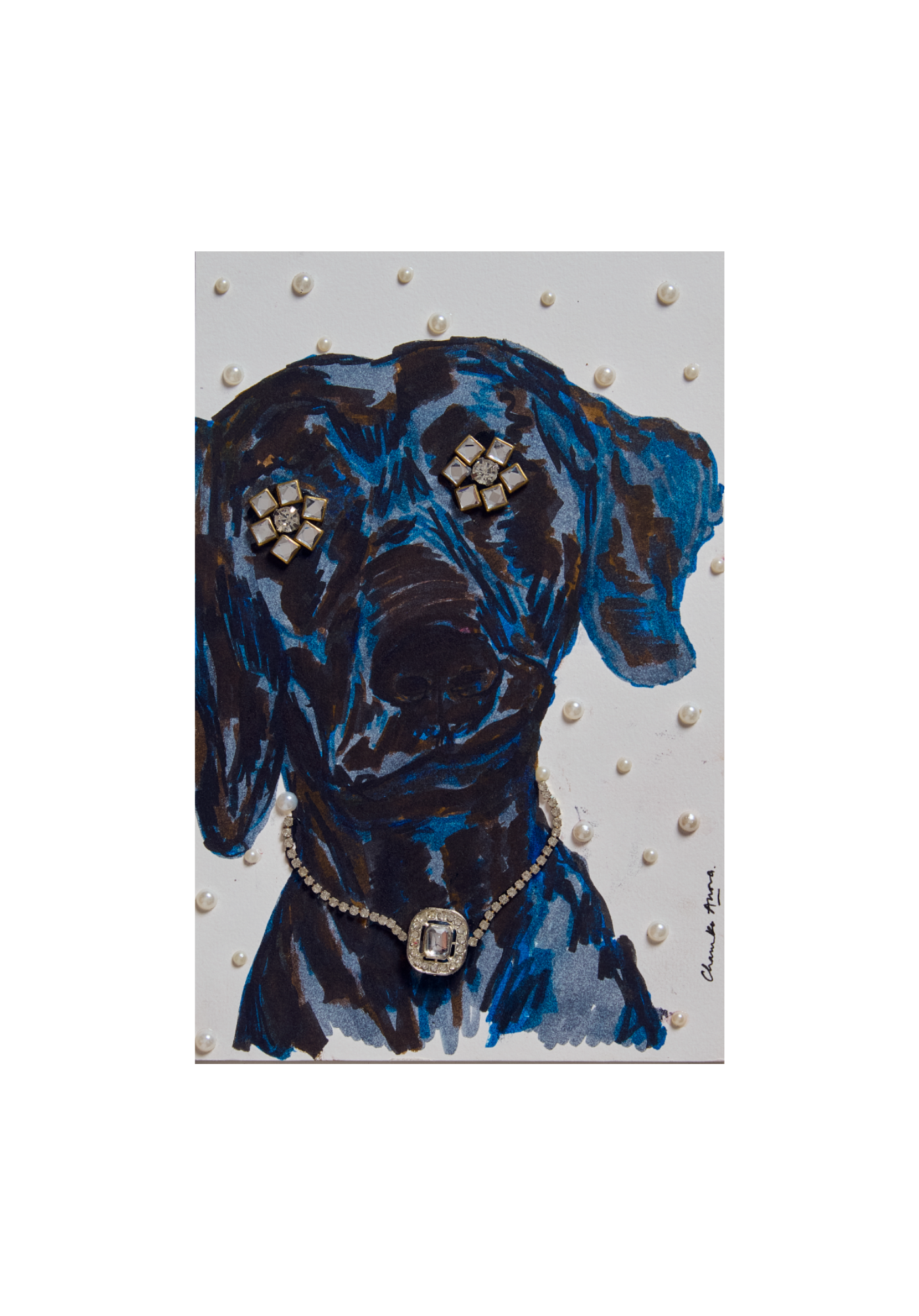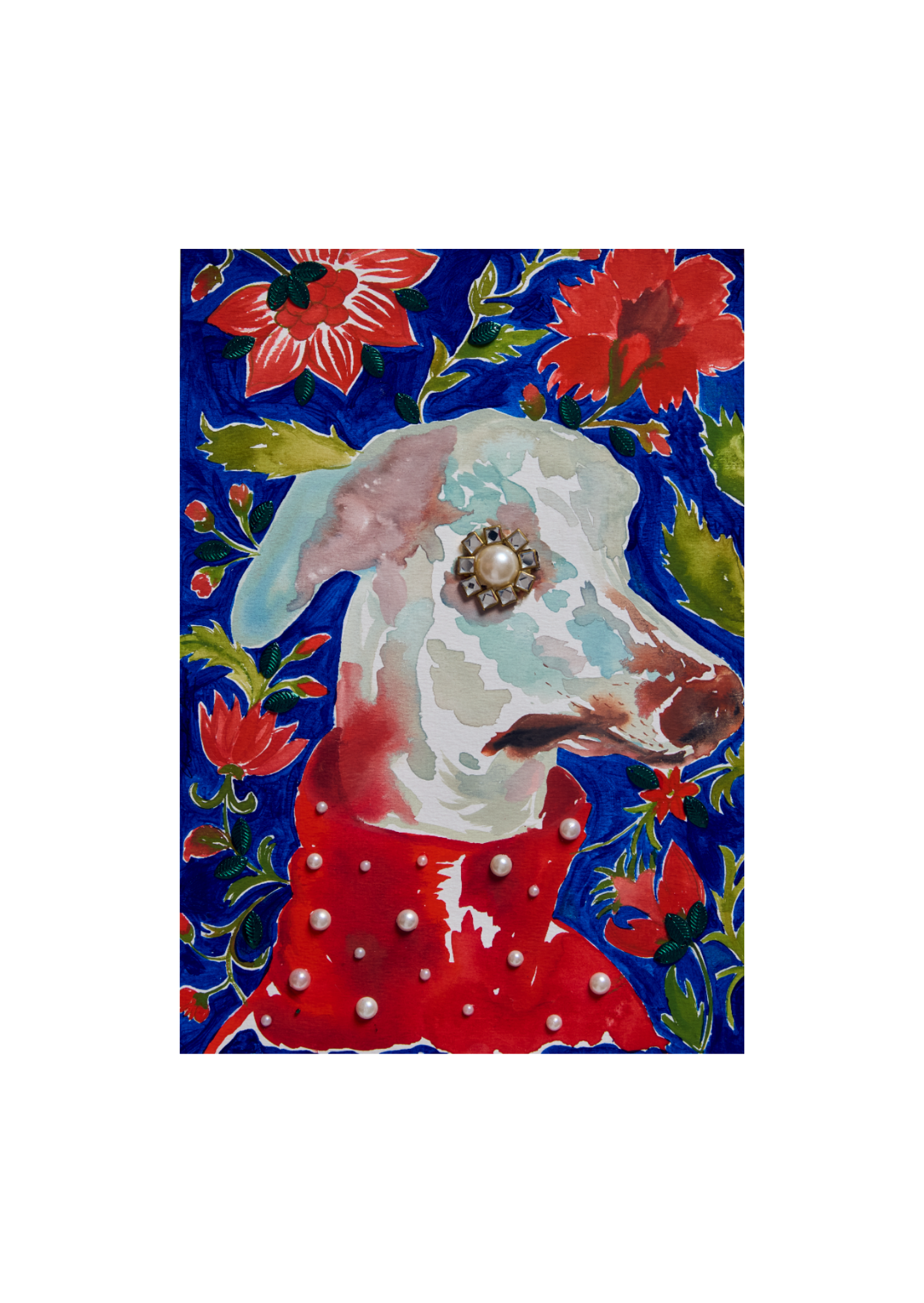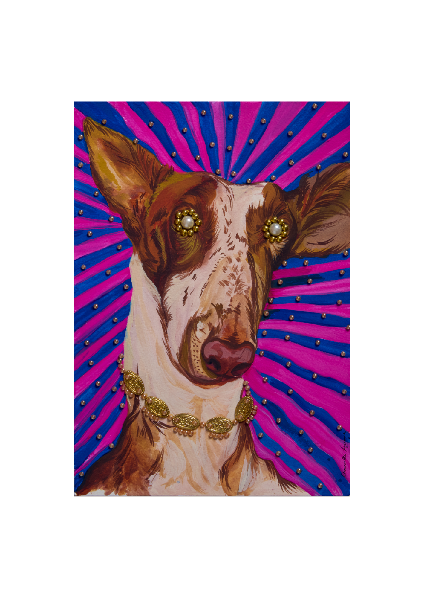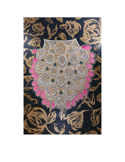 Charuka Arora is an internationally exhibited Indian visual artist, designer, and founder of Arts to Hearts Project. Born in Agra, she holds a B.A. in History and Advertising and pursued formal design studies at Pearl Academy and Domus Academy, grounding her practice in both historical inquiry and contemporary design thinking. Her work blends painting and handcrafted collage with intricate pearl, bead, and textile embellishments to explore womanhood, adornment, and cultural memory. Charuka has exhibited internationally at The Other Art Fair in Los Angeles and London, presented work at Woman Made Gallery (Chicago), and participated in curated group exhibitions and art fairs across the UK, Europe, and India. Alongside her studio work, she actively contributes to the global art dialogue through publishing, podcasting, and community-building, bringing together artistic depth, design precision, and community-building through her global platform. Her practice also extends into large-scale and public projects, including an 8000 sq. ft. headquarters installation in New Delhi, a live mural for Chitkara University and the International Dubai Awards, and a nationally traveling conceptual art initiative in collaboration with Government partners.